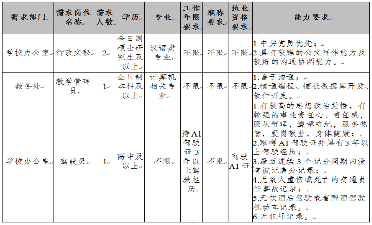 為適應學校發(fā)展的需要,需面向社會誠聘4名工作人員,現將有關事項公告如下: