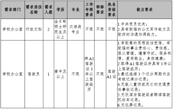為適應(yīng)學(xué)校發(fā)展的需要,需面向社會誠聘2名行政人員及1名駕駛員,現(xiàn)將有關(guān)事項(xiàng)公告如下: