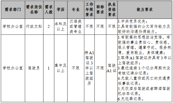 為適應(yīng)學(xué)校發(fā)展的需要,需面向社會(huì)誠(chéng)聘2名行政人員及1名駕駛員,現(xiàn)將有關(guān)事項(xiàng)公告如下: