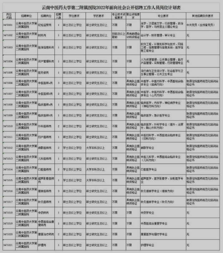 具體招聘要求可查看《云南省衛(wèi)生健康所屬事業(yè)單位2022年面向社會(huì)公開(kāi)招聘工作人員的公告》