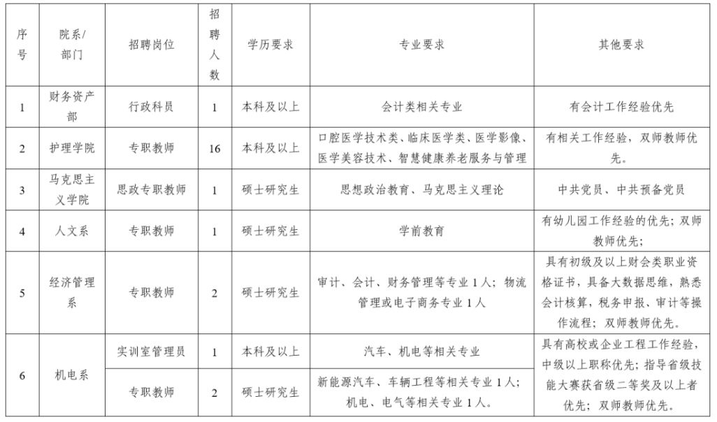 (2)所需專業(yè)為:學(xué)前教育、教育學(xué)等教育類專業(yè);計(jì)算機(jī)、人工智能、汽修、信息管理等機(jī)電類專業(yè);土木工程、建筑工程等工程類專業(yè);旅游管理、烹飪與營(yíng)養(yǎng)等專業(yè)或相近專業(yè)教育背景;