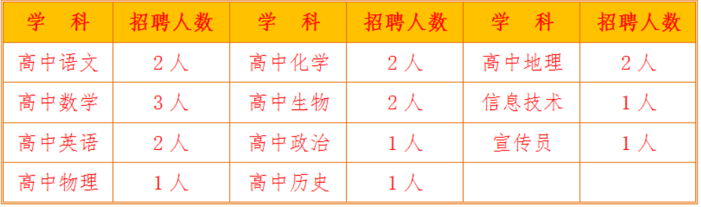 為適應(yīng)學(xué)校進一步發(fā)展的需要,適當(dāng)擴大高中招生,儲備部分學(xué)科教師,現(xiàn)面向全國引進或招聘部分優(yōu)秀高中學(xué)科教師。