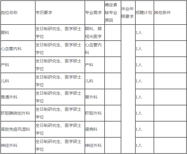 (一)市人民醫(yī)院。引進(jìn)崗位8個,其中眼科1個、心血管內(nèi)科1個、產(chǎn)科1個、兒科1個、普通外科1個、肝膽胰微創(chuàng)外科1個、腎臟免疫風(fēng)濕科1個、神經(jīng)外科1個。