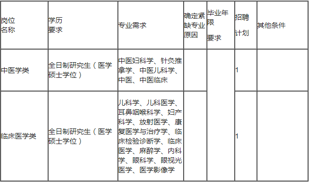 (二)市婦幼保健院。引進(jìn)崗位2個,其中中醫(yī)學(xué)類1個,臨床醫(yī)學(xué)類1個。