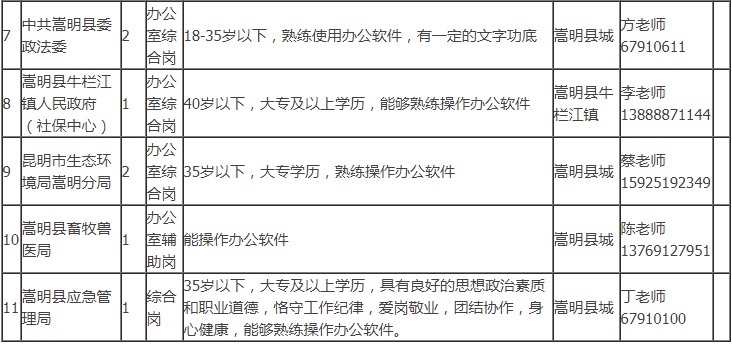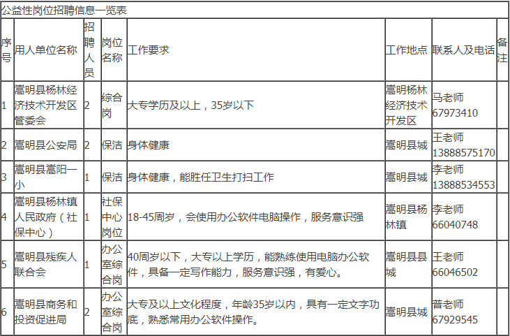 招聘具體事宜請(qǐng)咨詢(xún)用人單位。符合公益性崗位上崗條件的個(gè)人也可以到嵩明縣勞動(dòng)就業(yè)服務(wù)局綜合科申請(qǐng)公益性崗位求職登記,詳詢(xún)陳老師:0871-67917444。