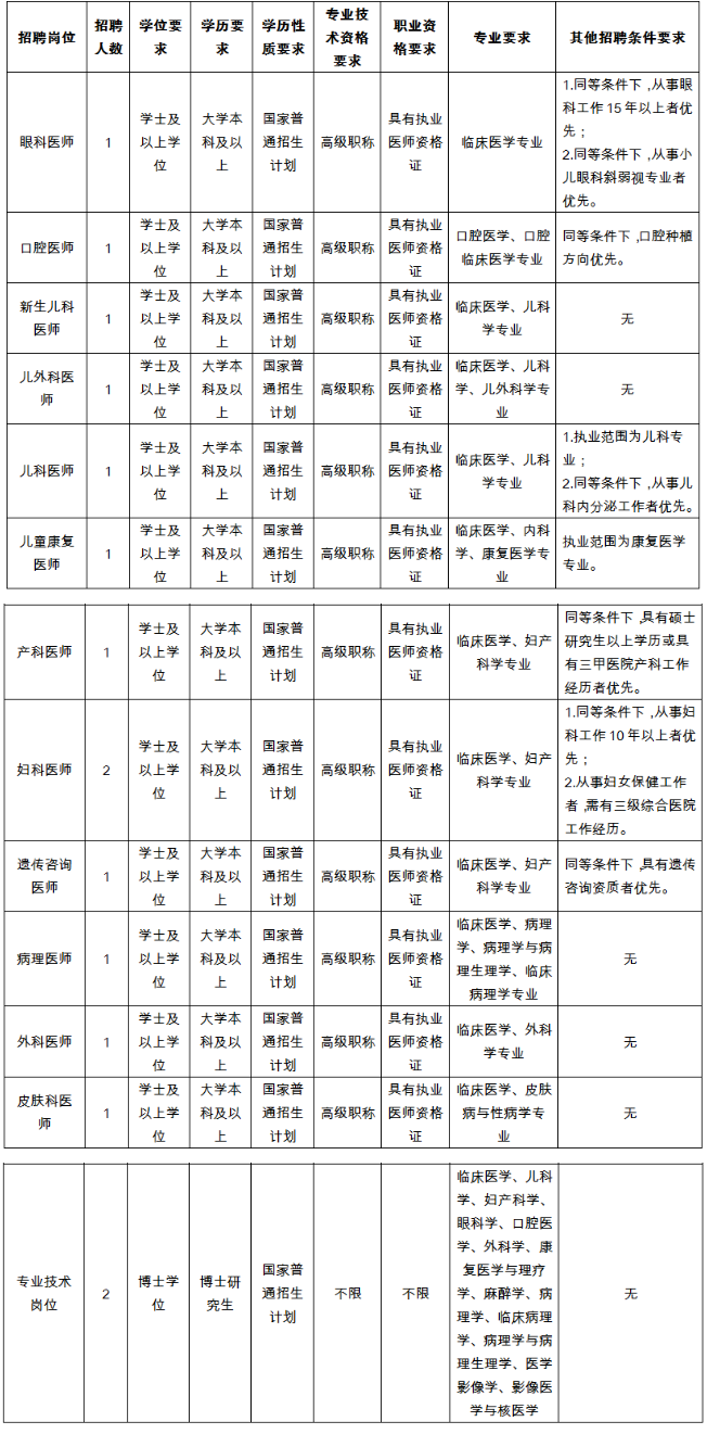 1.副高及以上職稱(新生兒科醫(yī)師、兒外科醫(yī)師、兒科醫(yī)師、兒童康復醫(yī)師、產(chǎn)科醫(yī)師、婦科醫(yī)師、病理醫(yī)師、外科醫(yī)師、皮膚科醫(yī)師)