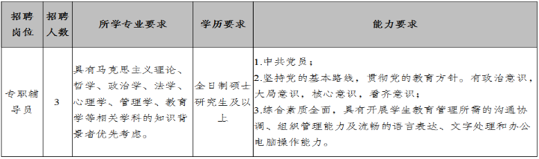 為適應(yīng)學(xué)校發(fā)展的需要,需面向社會(huì)誠聘3名專職輔導(dǎo)員,現(xiàn)將有關(guān)事項(xiàng)公告如下: